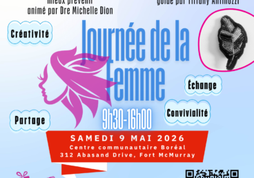 09 Mai 2026 au 09 Mai 2026 Centre communautaire Boréal - 312 Abasand Dr Fort McMurray T9J 1B2Journée de la femme – Prenez un moment pour vous.