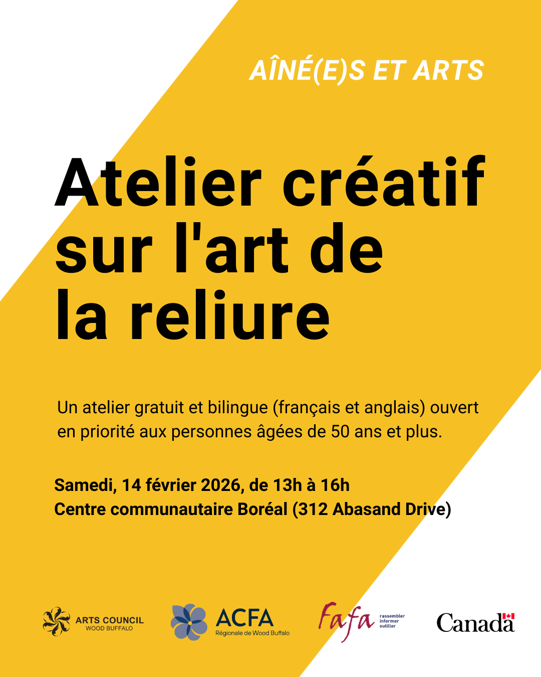 En collaboration avec Arts Council Wood Buffalo et la FAFA Fédération des aînés franco-albertains, nous sommes heureux de vous inviter à un atelier gratuit et bilingue (français et anglais), ouvert en priorité aux personnes âgées de 50 ans et plus.