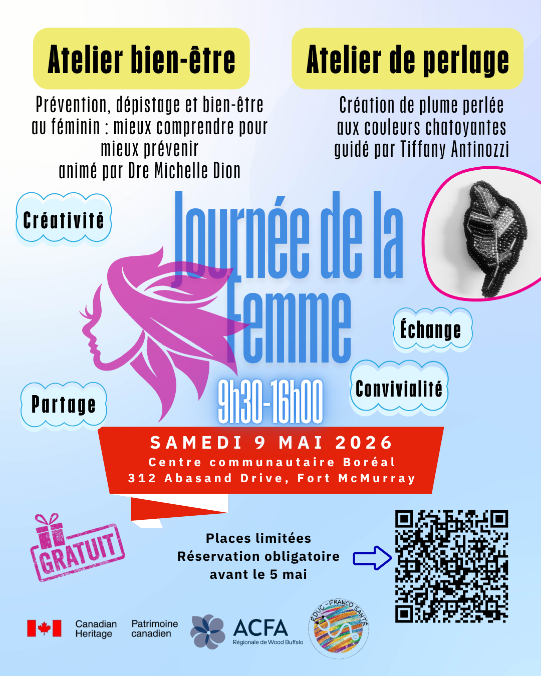 Le 9 mai, de 9 h 30 à 16 h, venez célébrer la Journée de la femme au Centre communautaire Boréal lors d’une journée placée sous le signe du bien-être, du partage et de la créativité.
