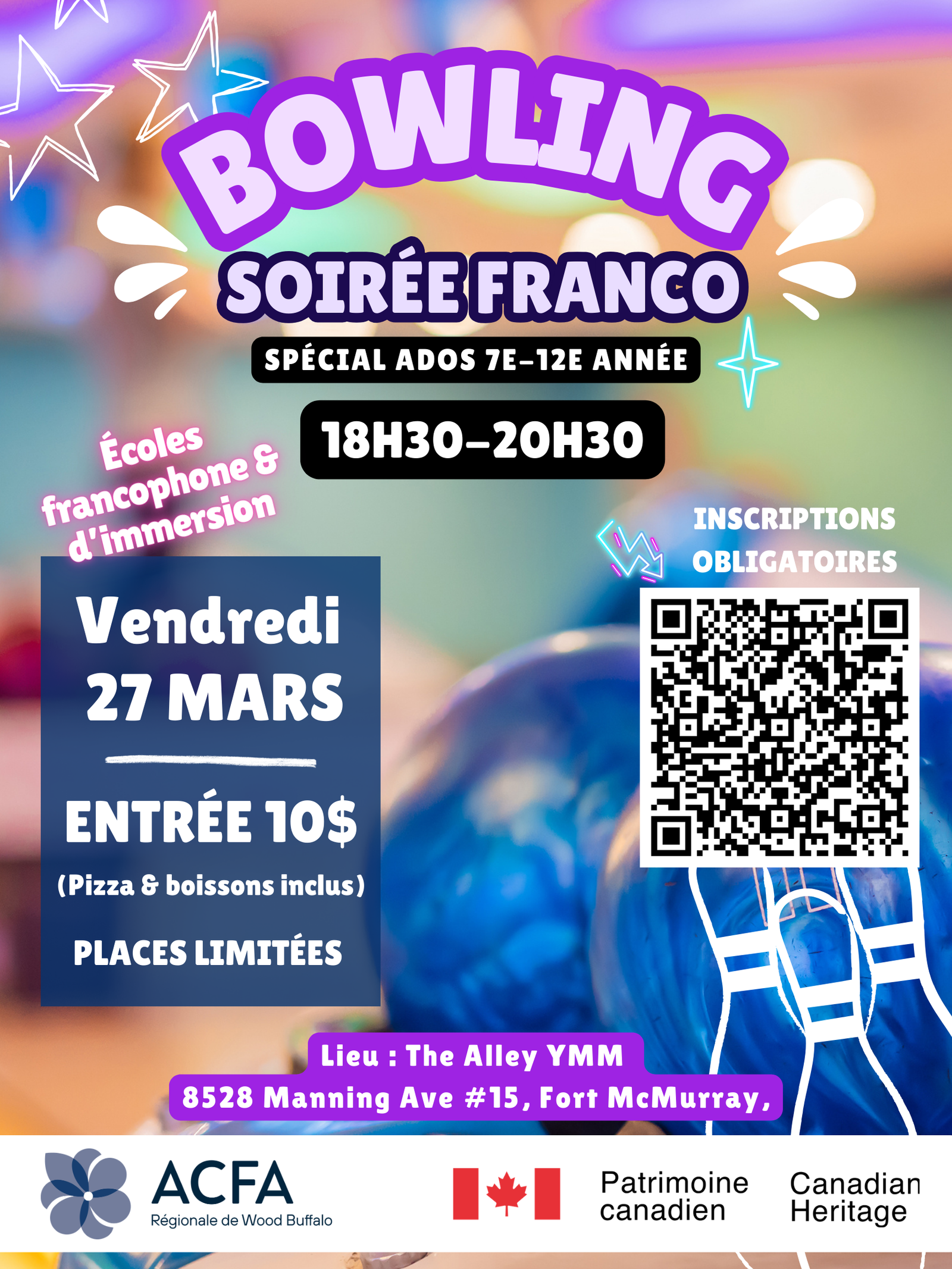 L’ACFA régionale de Wood Buffalo a le plaisir d’inviter les élèves de la 7E à la 12E des écoles francophones et d’immersion, à une soirée bowling en français, dans le cadre du Mois de la francophonie.
