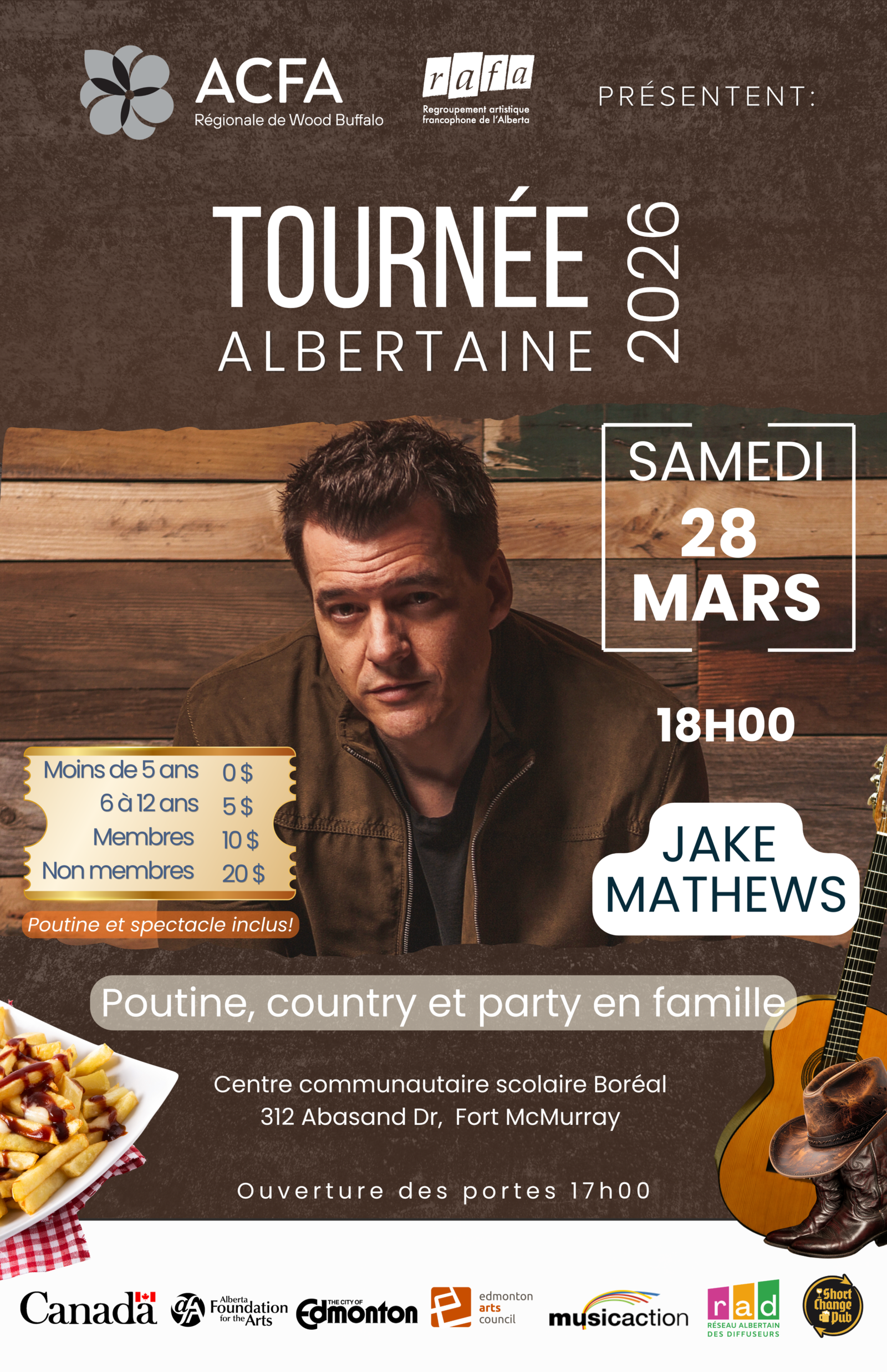 Le 28 mars 2026, l’ACFA régionale de Wood Buffalo vous donne rendez-vous au Centre communautaire Boréal – 312 Abasand Drive – pour une soirée festive dans le cadre de la tournée albertaine avec le RAFA – Regroupement artistique francophone de l’Alberta.